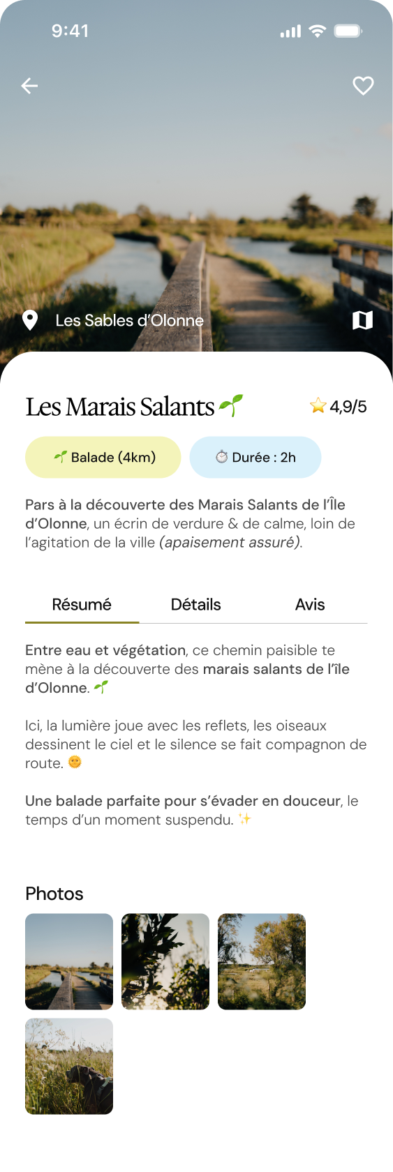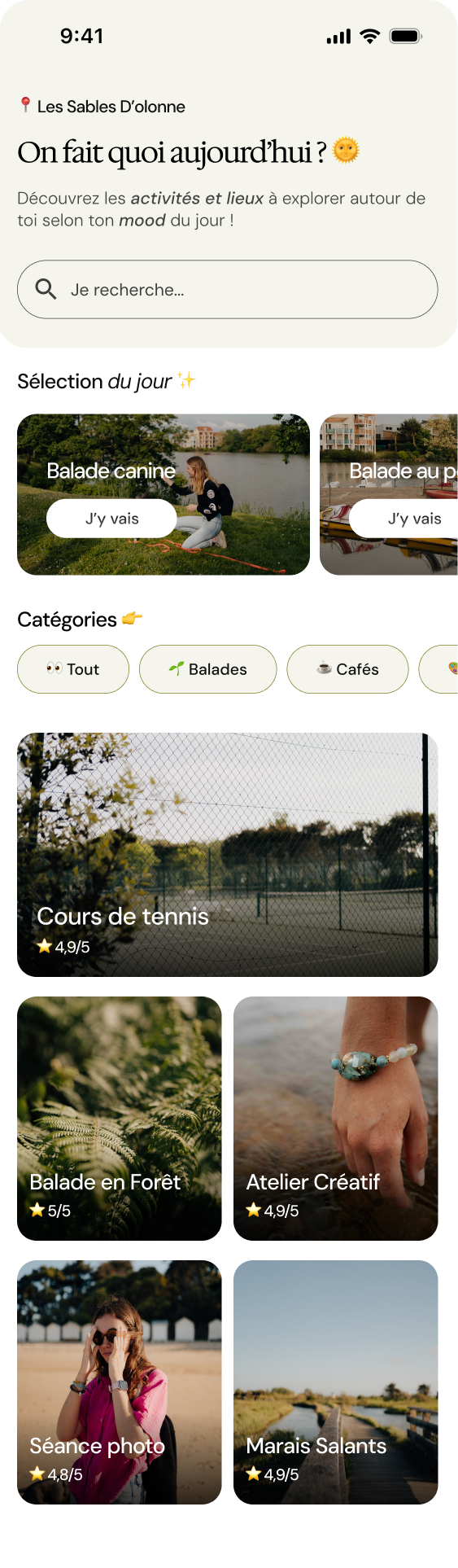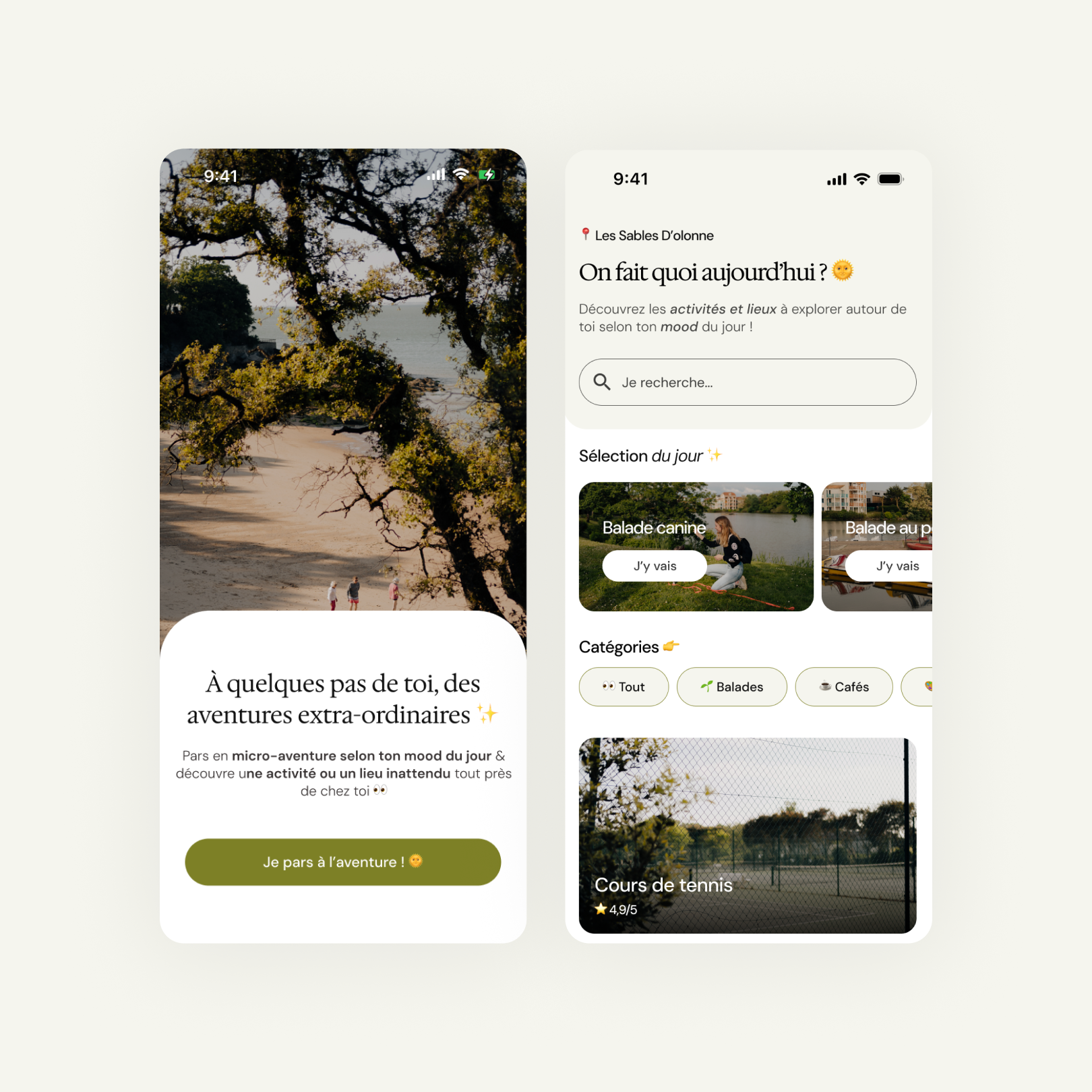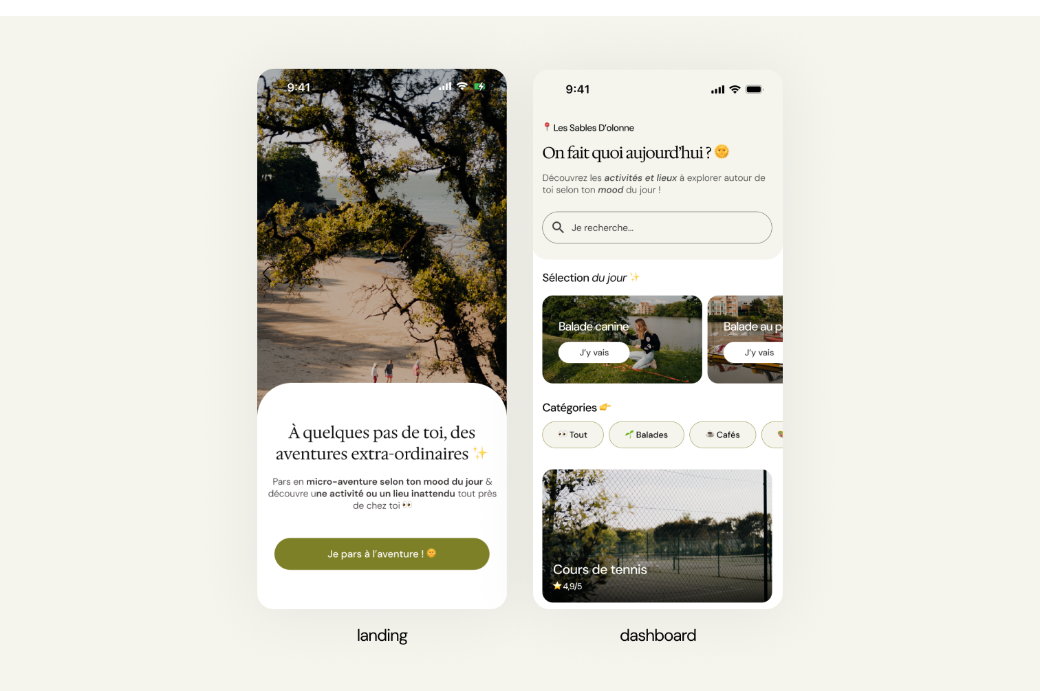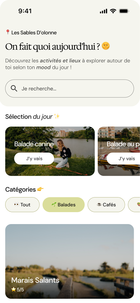 Parcours simplifié : De la sélection par humeur jusqu’aux détails pratiques, en passant par une page d’activité complète avec photos et informations.