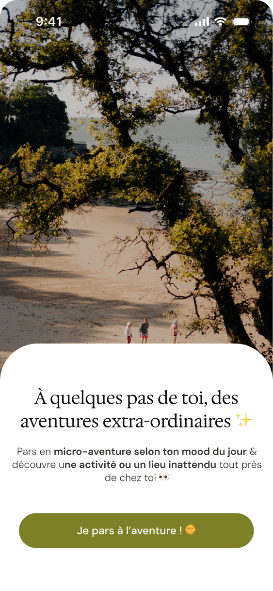 Projet fictif, conception UX/UI d’une application mobile. Cette application propose aux utilisateur de découvrir et d’explorer des activités locales selon leurs humeurs et envies du moment.